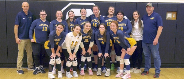 Ogdensburg celebrates winning the first of three sets, en route to sweeping Potsdam 3-0 for the Section X Class B championship. (Cody Jenne photo)