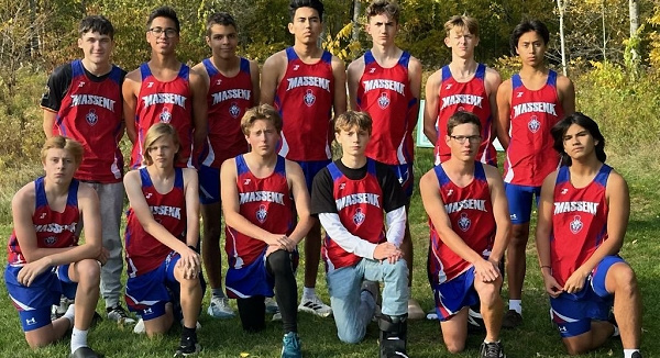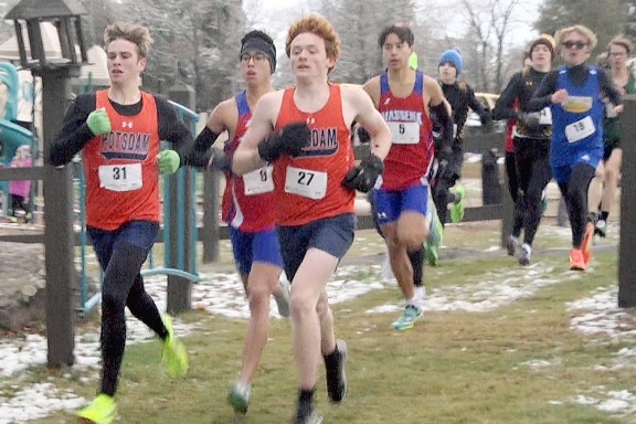 Competitors from Potsdam and Massena jockey for second and third place positions in the 2025 Section X Cross Country boys championship. (Cody Jenne photo)